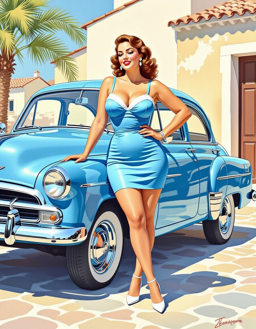 This watercolor portrait features a beautiful, curvy woman in a blue minidress posing by a classic blue Renault on the Mediterranean coast. The image captures a detailed, intimate scene.
