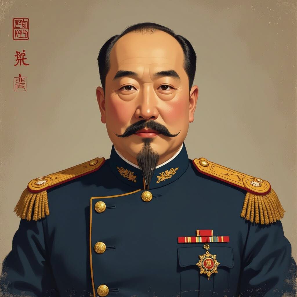 This image shows a portrait of Yuan Shikai in a dark blue and gold military uniform. The style is reminiscent of traditional Chinese portraiture with a focus on formal attire and distinctive facial features.