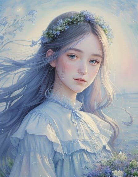 This dreamy watercolor portrait features a delicate face with sparkling sapphire eyes surrounded by swirling blue stars and flowers, rendered in soft focus with monochromatic blues and pastel hues.