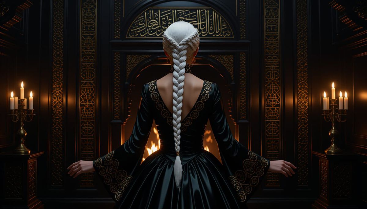 A striking picture of a regal woman with braided white hair rising in a gilded chamber. The cinematic lighting and atmospheric mysticism are reminiscent of futuristic realism.