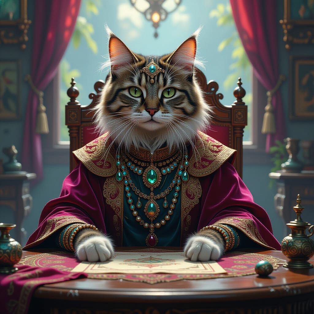 A captivating image of a fortune-telling cat adorned with jewelry and robes, seated at an antique table surrounded by mystical artifacts. The artwork has dreamlike details and ethereal atmosphere.