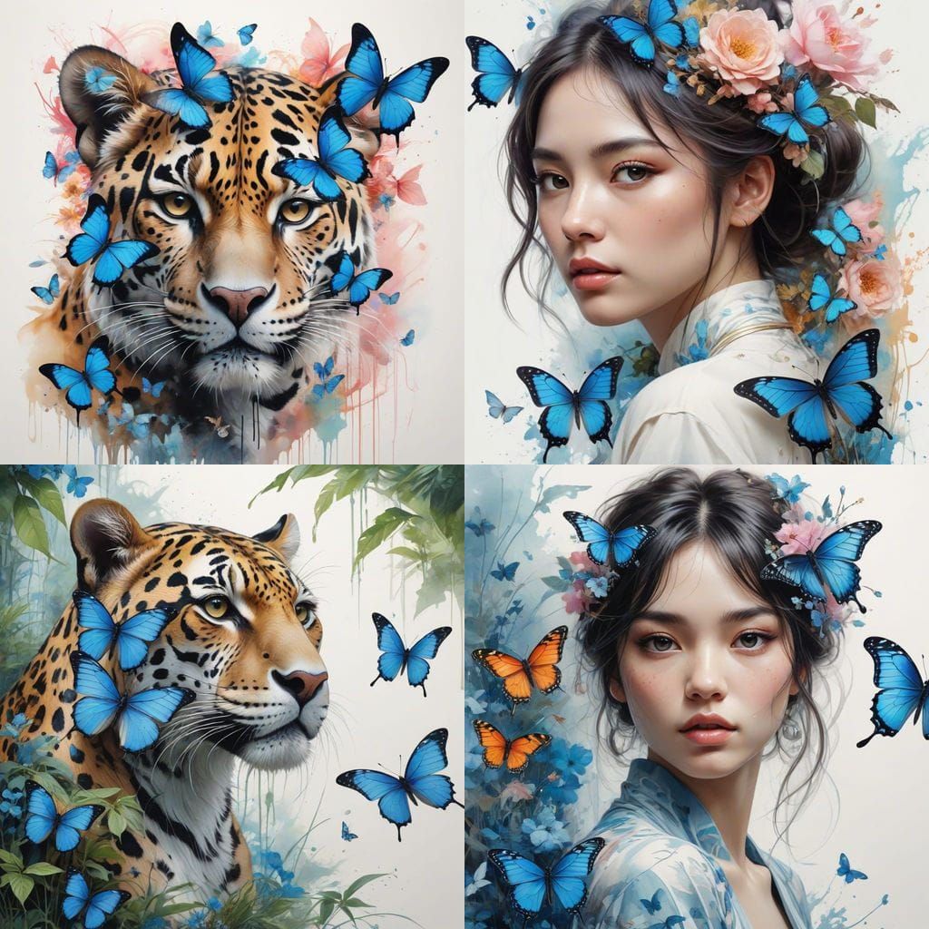This enchanting artwork depicts a jaguar in a serene rainforest setting, surrounded by blue butterflies and vibrant accents. Inspired by traditional craft and modern abstraction, the piece combines delicate pastel hues with dynamic digital enhancements, incorporating Japanese cultural motifs and symbolic...
