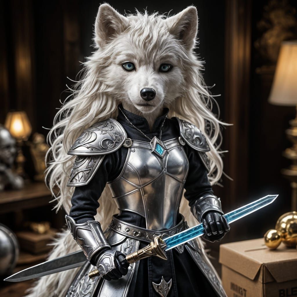A beautifully shot, hyperrealistic image of a female white wolf superhero doll holding a mini ice sword in a decorative cardboard box, showcasing intricate details and cinematic lighting.
