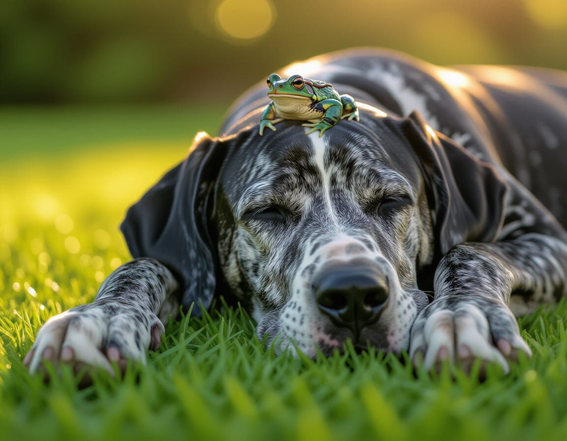 A harlequin Great Dane sleeping in the front lawn with a toad on his head.