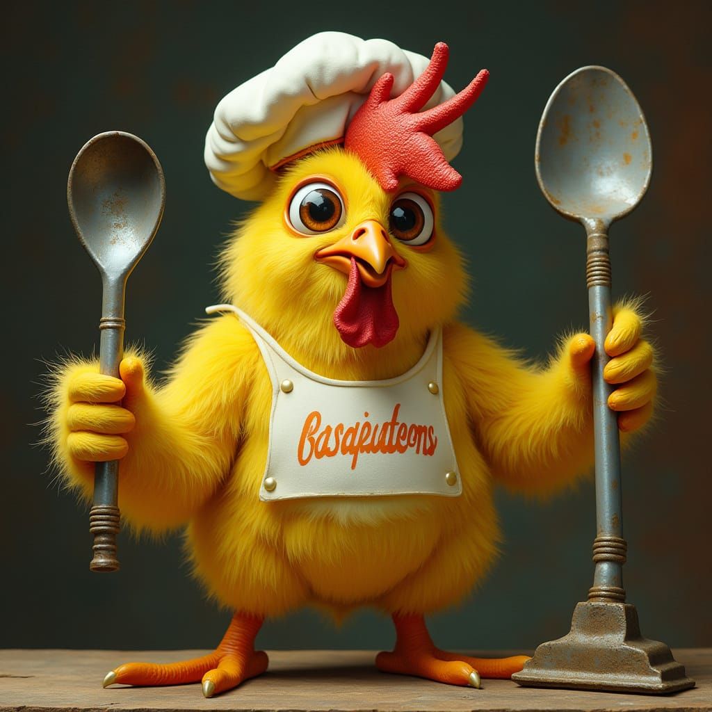 This image depicts a surreal, futuristic yellow chicken with small wings, chef attire, and vacuum attachments. The artwork features surrealist and futuristic details.