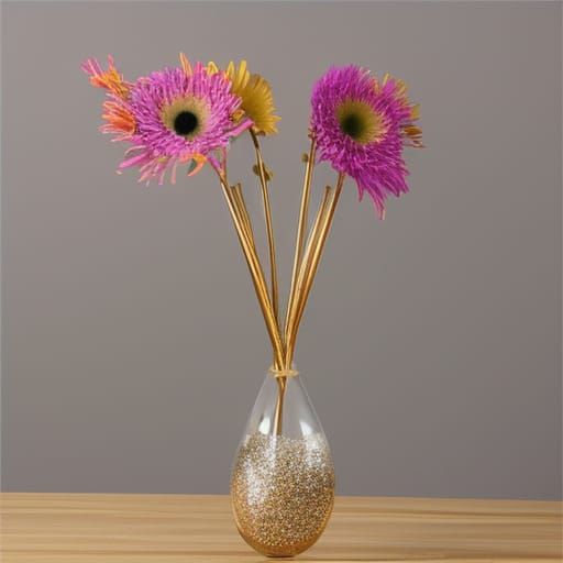This image shows sparkling sand artfully arranged inside circular vases. The composition features a round, framed design with controlled colors, creating a visually appealing and modern aesthetic.