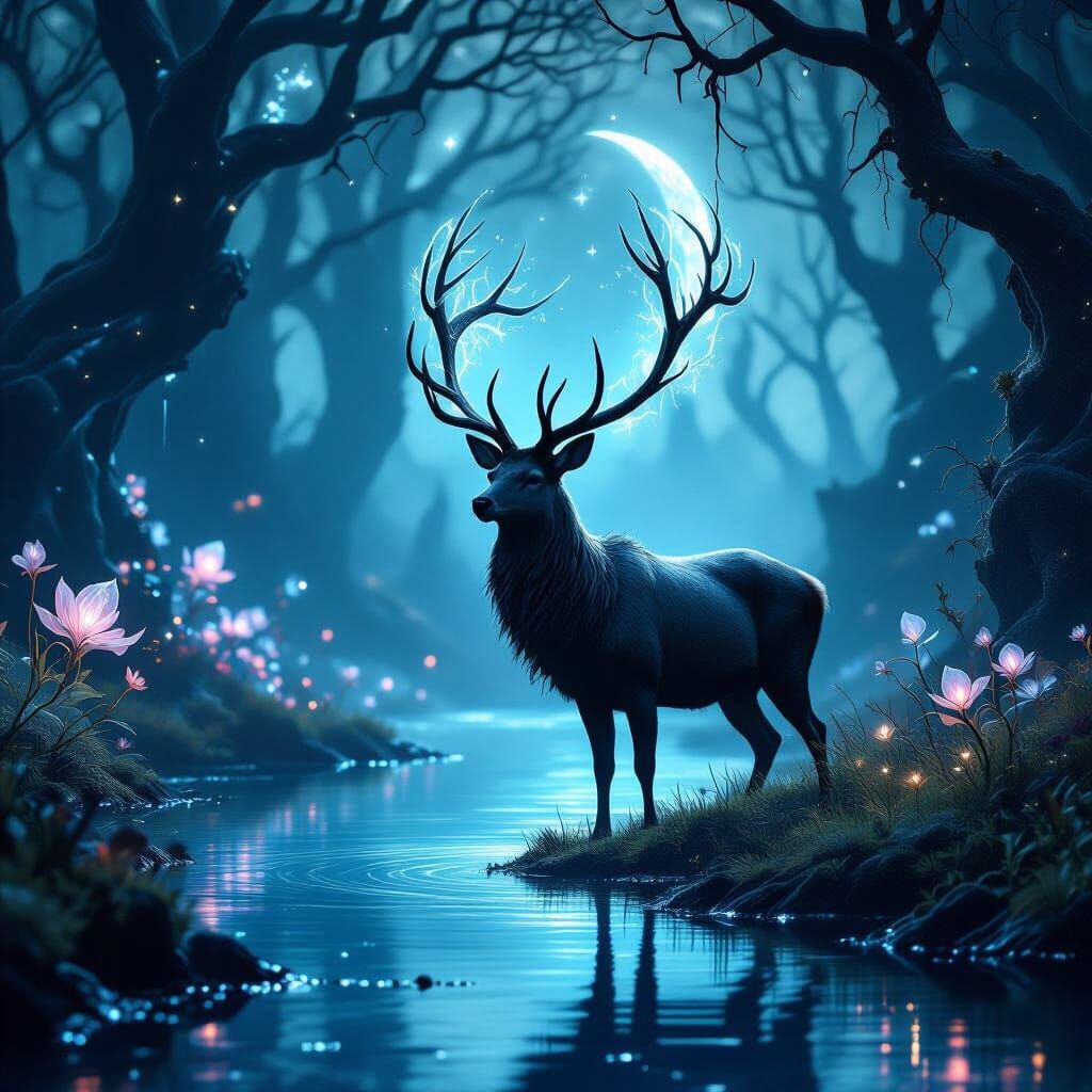 This image depicts a majestic stag with antlers of moonlight and stardust overlooking a glowing lake in an enchanted forest. Rendered in dark fantasy concept art style with surreal, atmospheric depth.