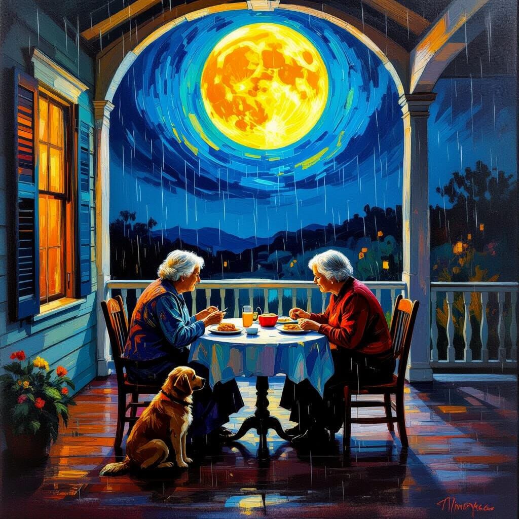 This image features an old woman and her dog sharing a meal on a large porch at night. A brightly colored full moon casts dramatic shadows, with rain visible outside, all rendered in a thick, textured impasto style.