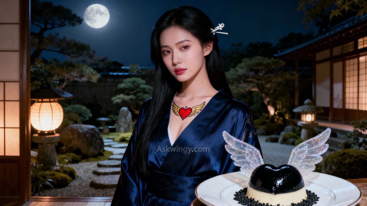A cinematic film still of a beautiful woman in a midnight blue silk kimono, standing in a moonlit Japanese zen garden with lantern light. Features soft makeup and intricate tattoos.