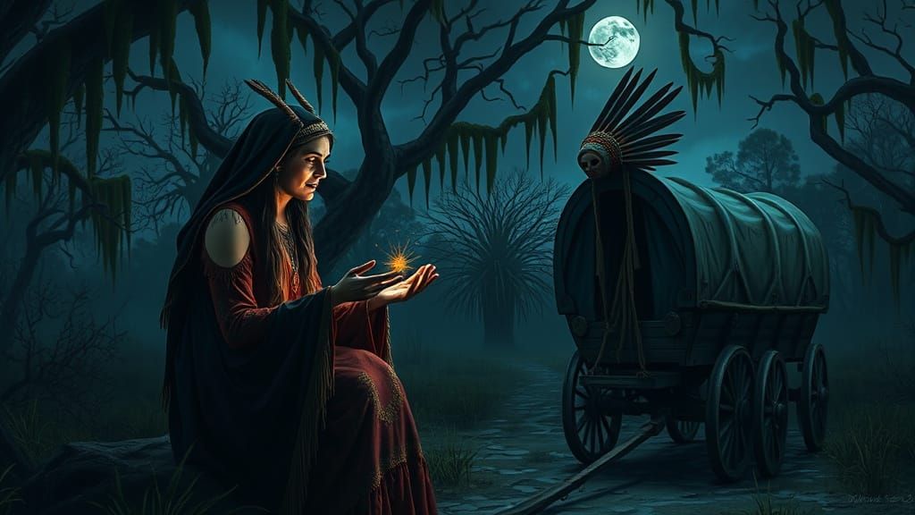 This image shows a fortune teller reading the future of a young Native American man. The scene is set in a Louisiana bayou at night, rendered in a neo-primitivism style.