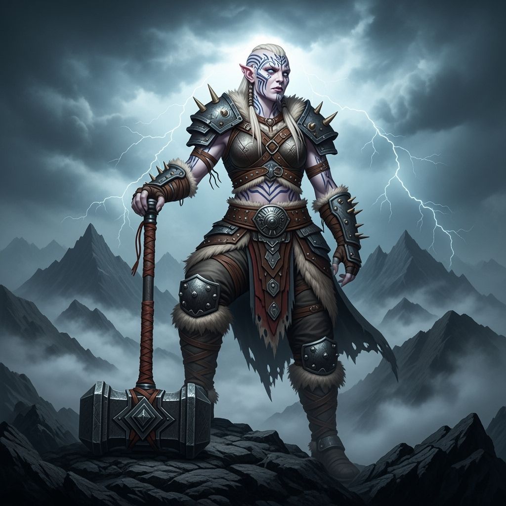 An intimidating albino orc warrior with tribal tattoos stands on a desolate mountain peak, gripping a massive warhammer. Ominous storm clouds and lightning create a dark, moody atmosphere.