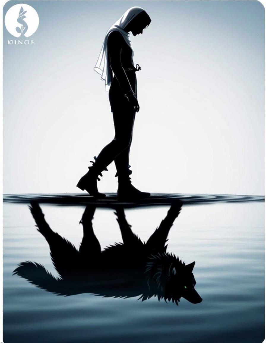 This image shows a serene woman in a white hijab walking on water. Her reflection reveals a majestic alpha wolf, symbolizing her inner strength in a detailed 3D anime style.
