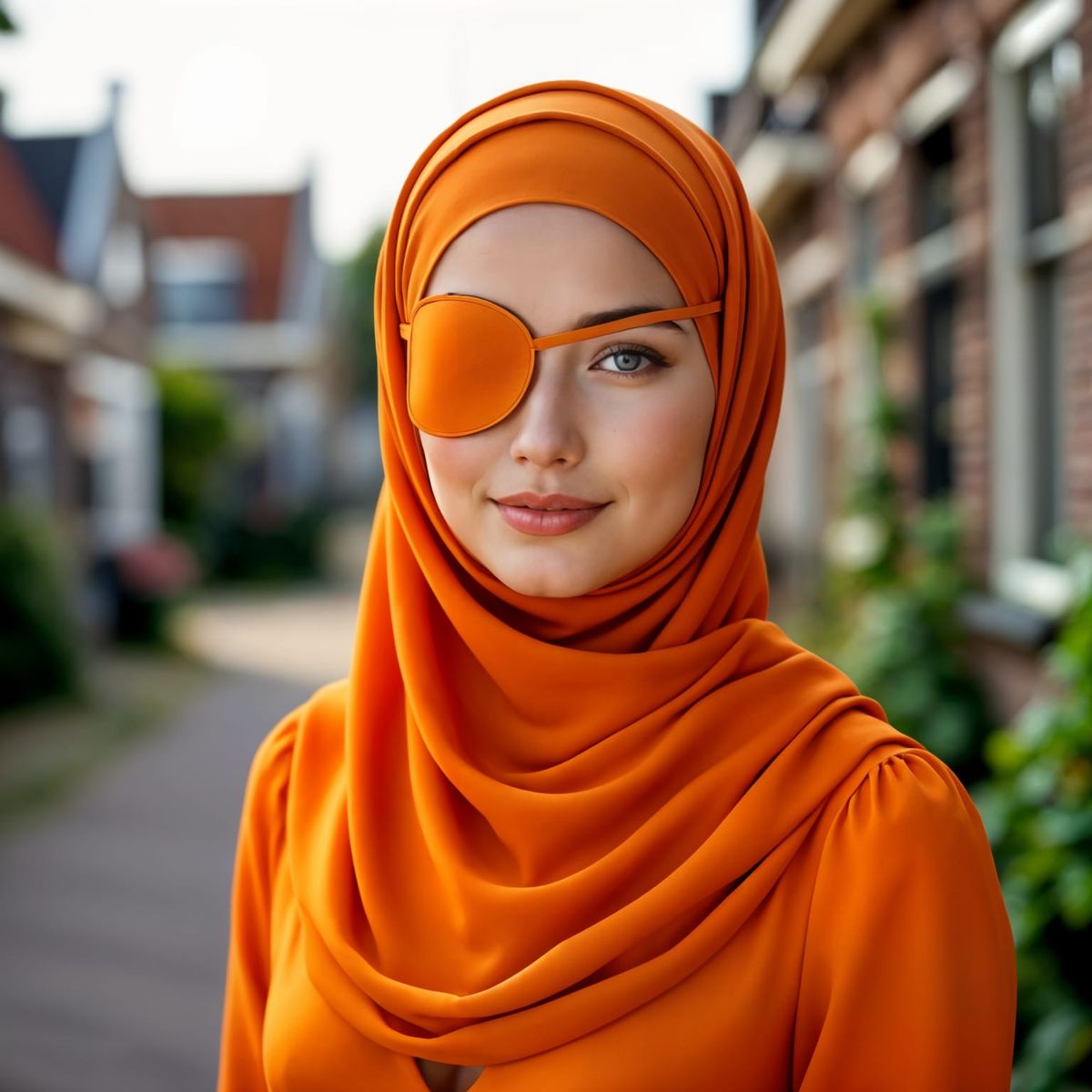 Cinematic portrait of a slightly overweight Dutch woman with a cute expression, wearing an orange hijab and matching eyepatch. Background evokes a Dutch village, in the style of classical Dutch masters.