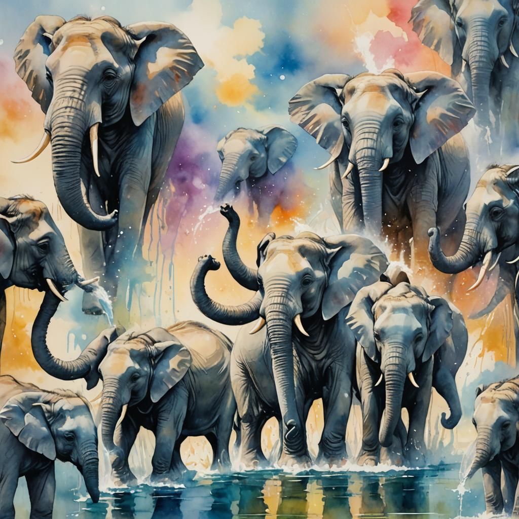 A surreal watercolor of ten elephants balancing on each other, spraying water. The image features soft focus, heavenly light, and gentle brushstrokes. Pastel colors create a dreamy, ethereal aesthetic.