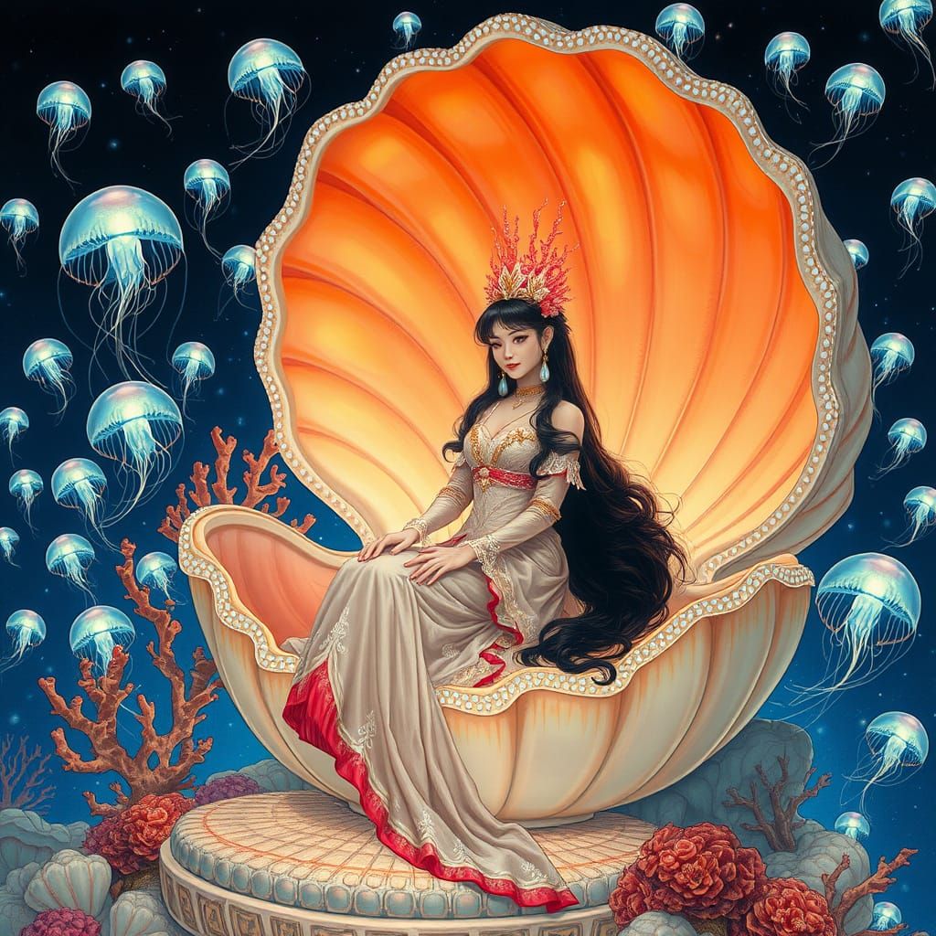 A stunning image of Princess Otohime on a clam throne in an undersea palace. The scene features bioluminescent jellyfish and combines Japanese folklore elements with an Art Nouveau aesthetic.