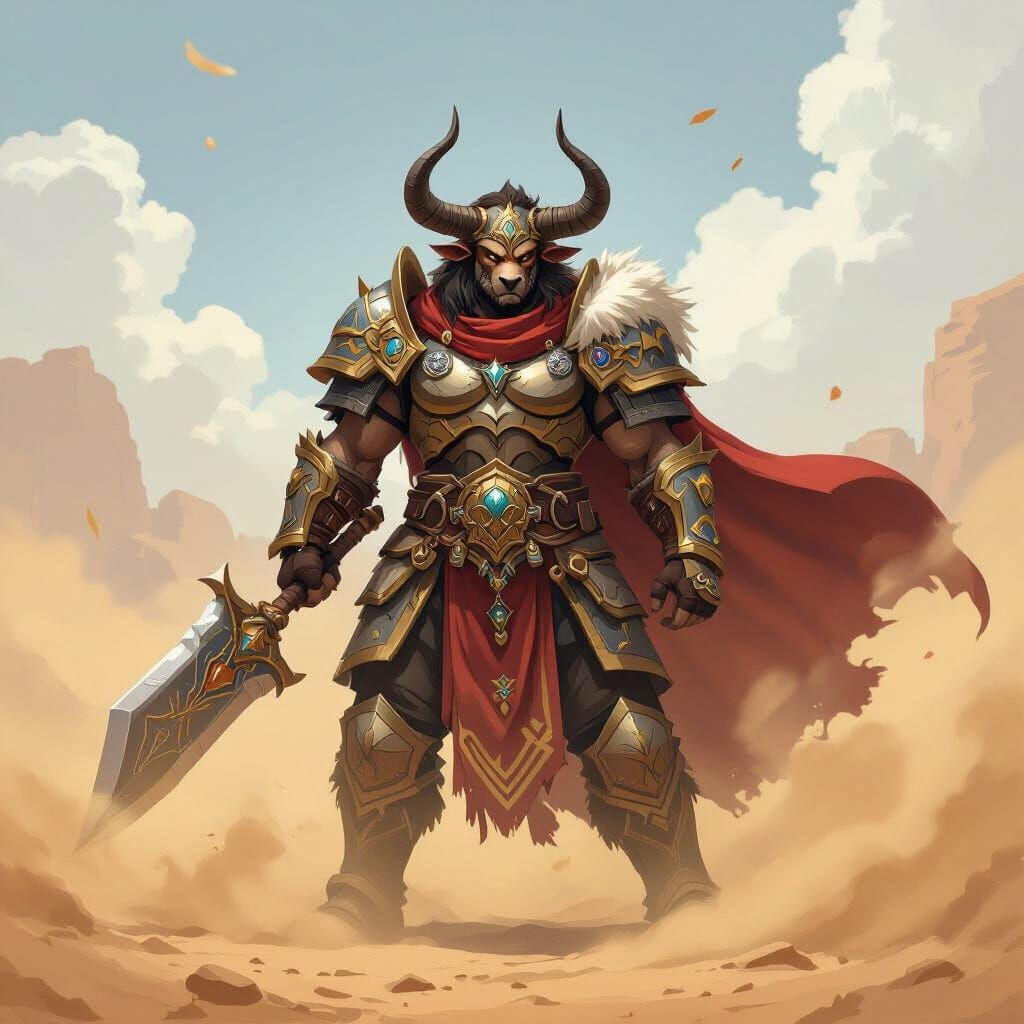 A heroic Tauren warrior stands amidst a dust storm in ornate armor. The image evokes a World of Warcraft aesthetic, with art direction inspired by digital fantasy painting.