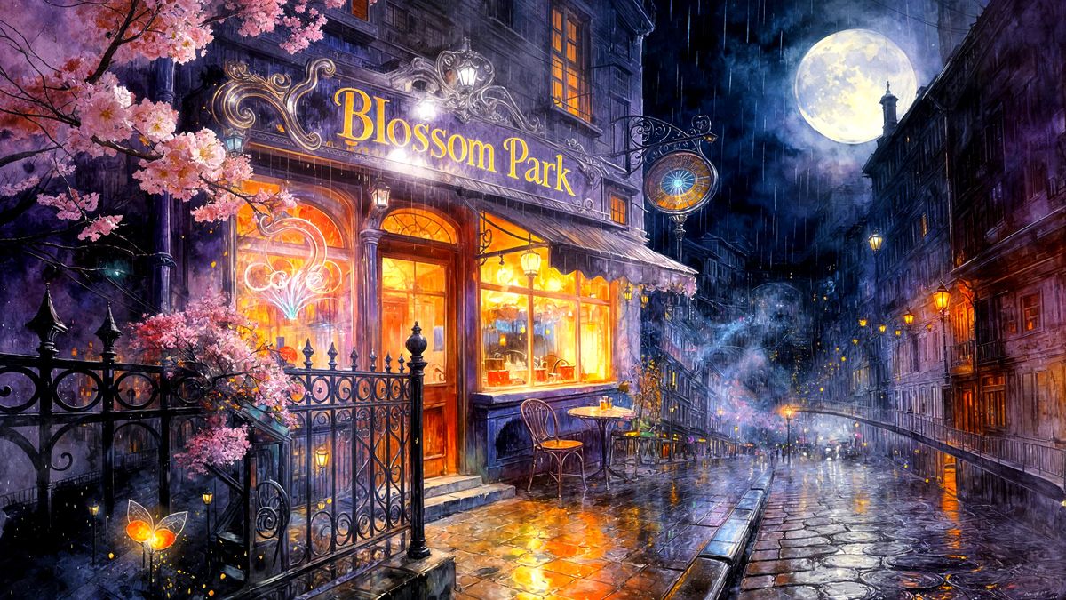 This image captures a vibrant, colorful alley on a moonlit rainy night, rendered in an expressive watercolor and oil mix with strong brushstrokes and cinematic lighting. Features deep colors and intricate fantasy details.