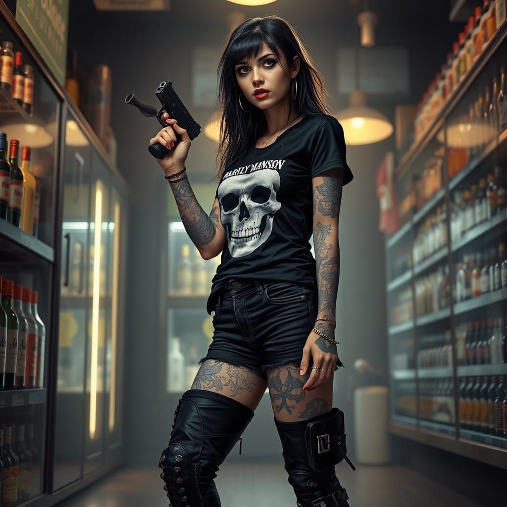 A photorealistic image of a gothic woman in a liquor store holding a pistol. She wears a black tee shirt and denim shorts, and has skull tattoos. The image has precise textures and realistic lighting.