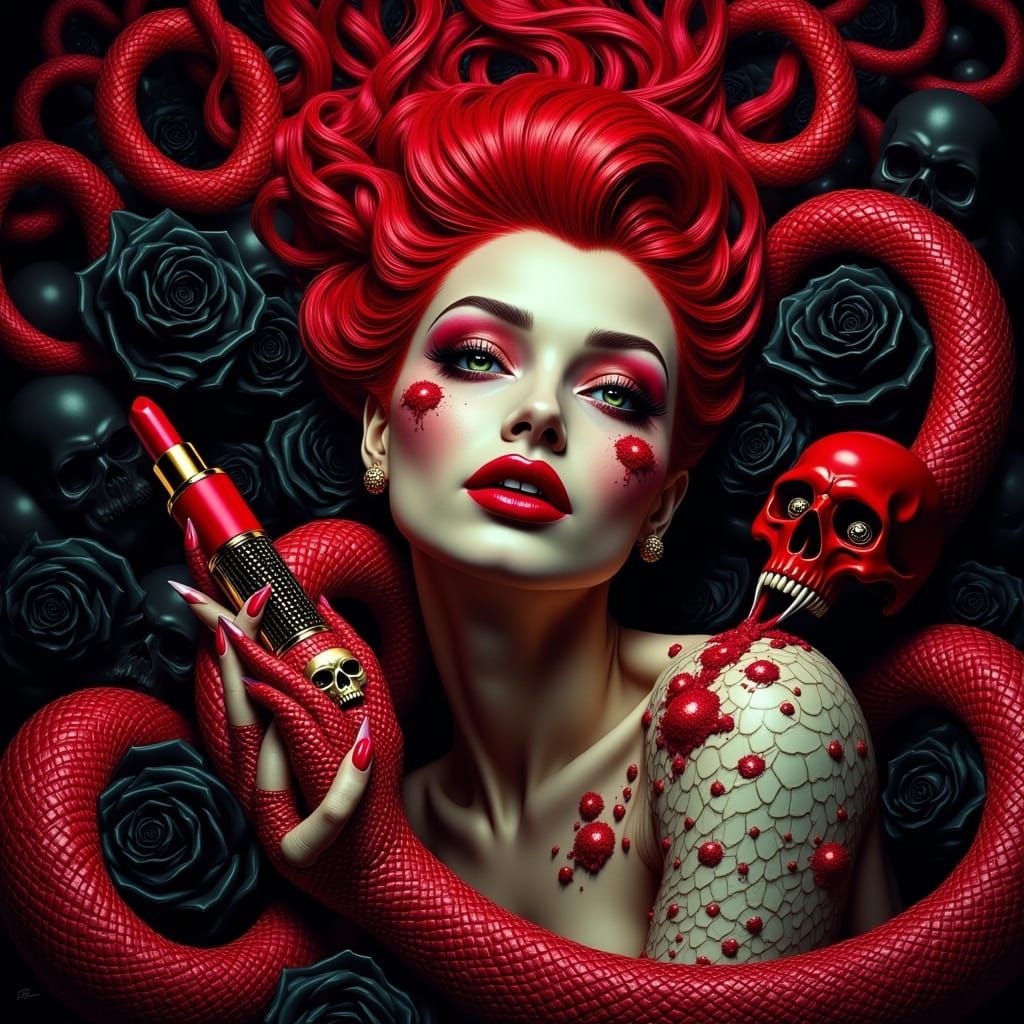 This image shows a dramatic, hyper-realistic pin-up of a viper hybrid woman with blood red hair and iridescent scales, surrounded by bold, dark colors and skulls, with a focus on exotic features and sharp cheekbones, reminiscent of pulp comic art.