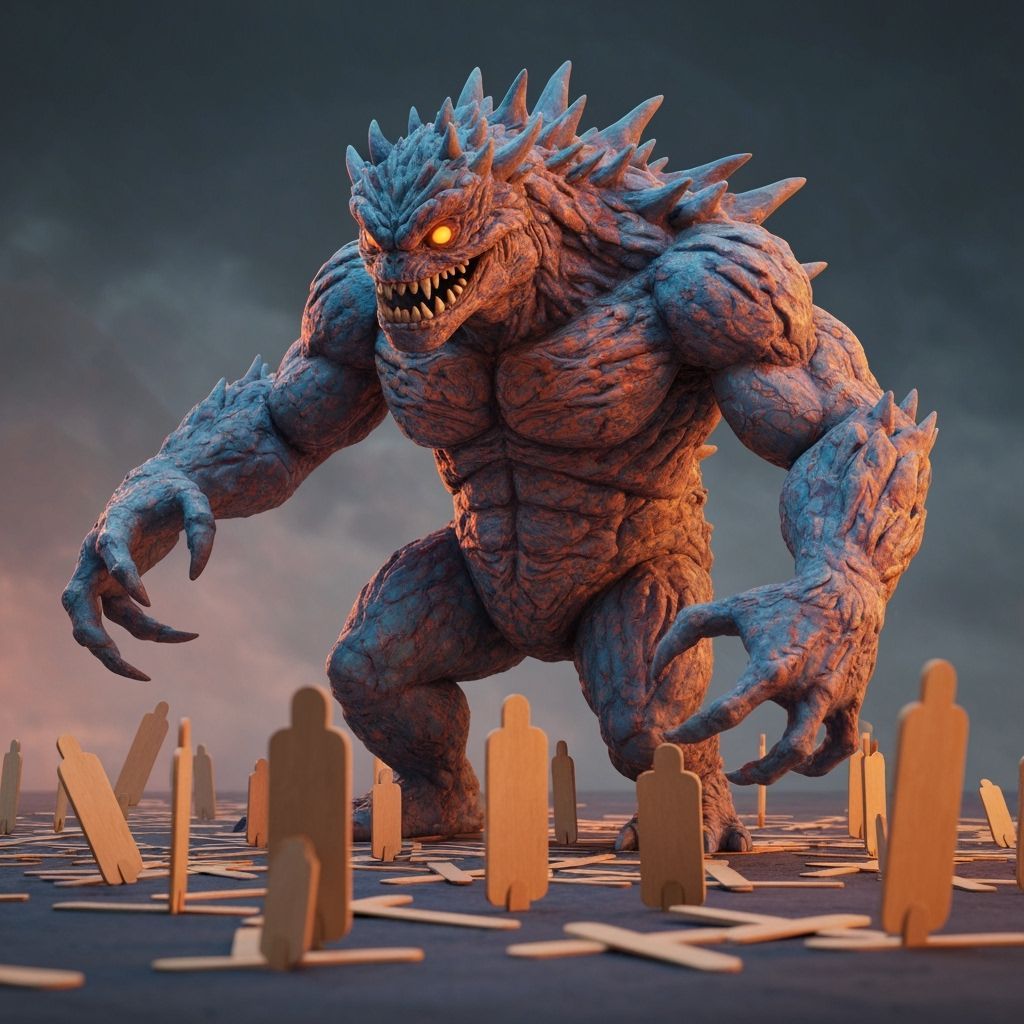 This image shows a clay monster destroying a city made of popsicle sticks. The scene is digital matte painting with fantasy concept art elements, rendered in 8k with Unreal Engine 5, focusing on intricate textures and complementary colors.
