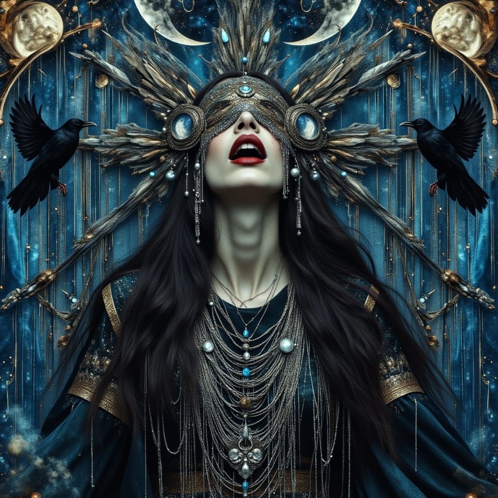A striking picture of a blindfolded vampire oracle with fangs. The dark, mystical attire contrasts with a shimmering midnight-blue banner featuring crescent moons and silver-eyed ravens in an art nouveau aesthetic.