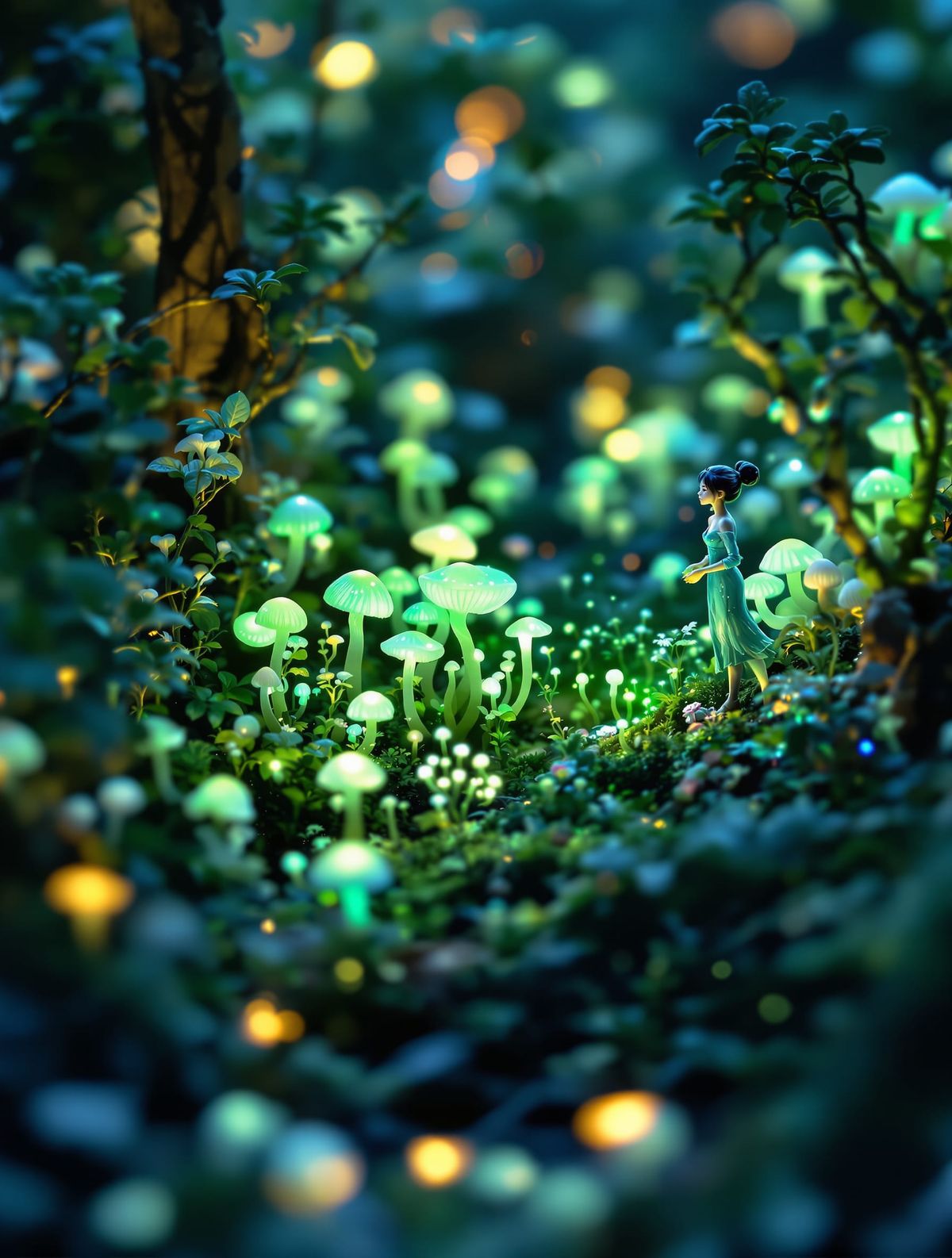 This image depicts a detailed miniature diorama of a woman in a glowing forest with ethereal lighting. It showcases a surreal, magical environment with intricate, fantastical elements.