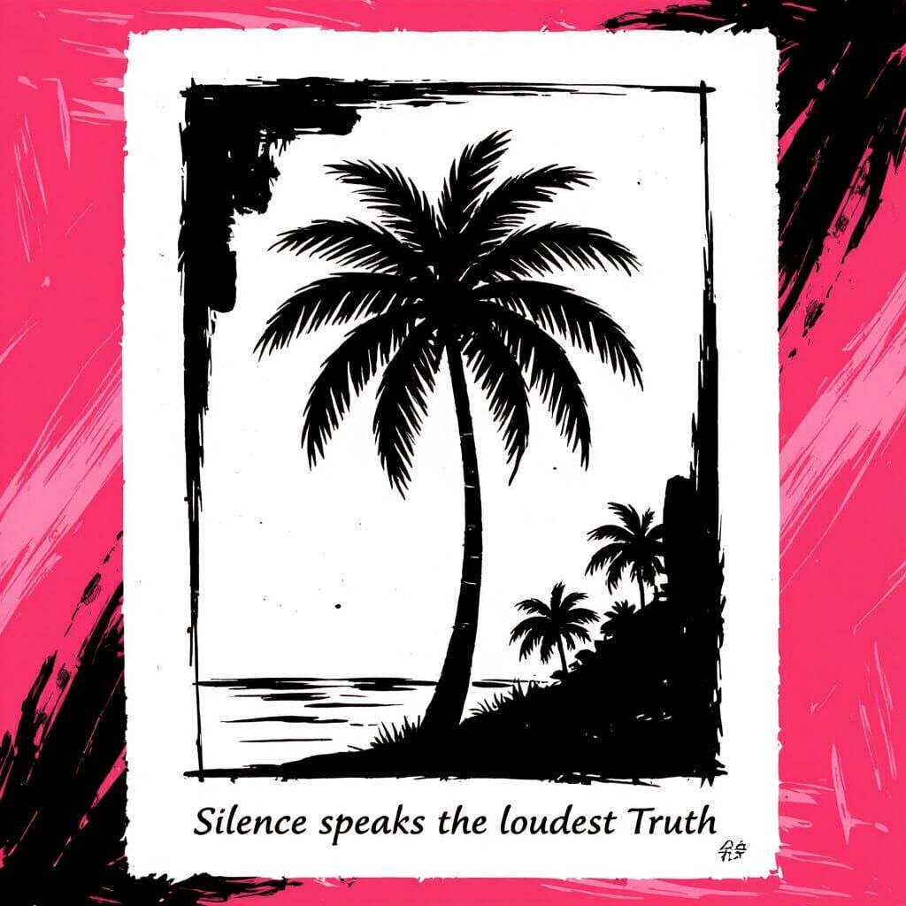 This image features a stark black graphic drawing of a palm tree in a rectangle, placed over expressive pink brushstrokes. It's set against a clean white background, with text below. Inspired by minimalist ink wash and bold graphic art styles.