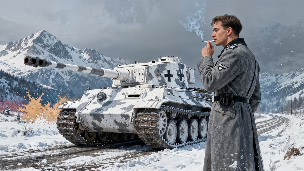 This hyperrealistic concept art shows a WWII German Tiger Tank in white and grey camouflage on a snowy road, with a soldier standing beside it. Features dramatic lighting and vivid gradients.