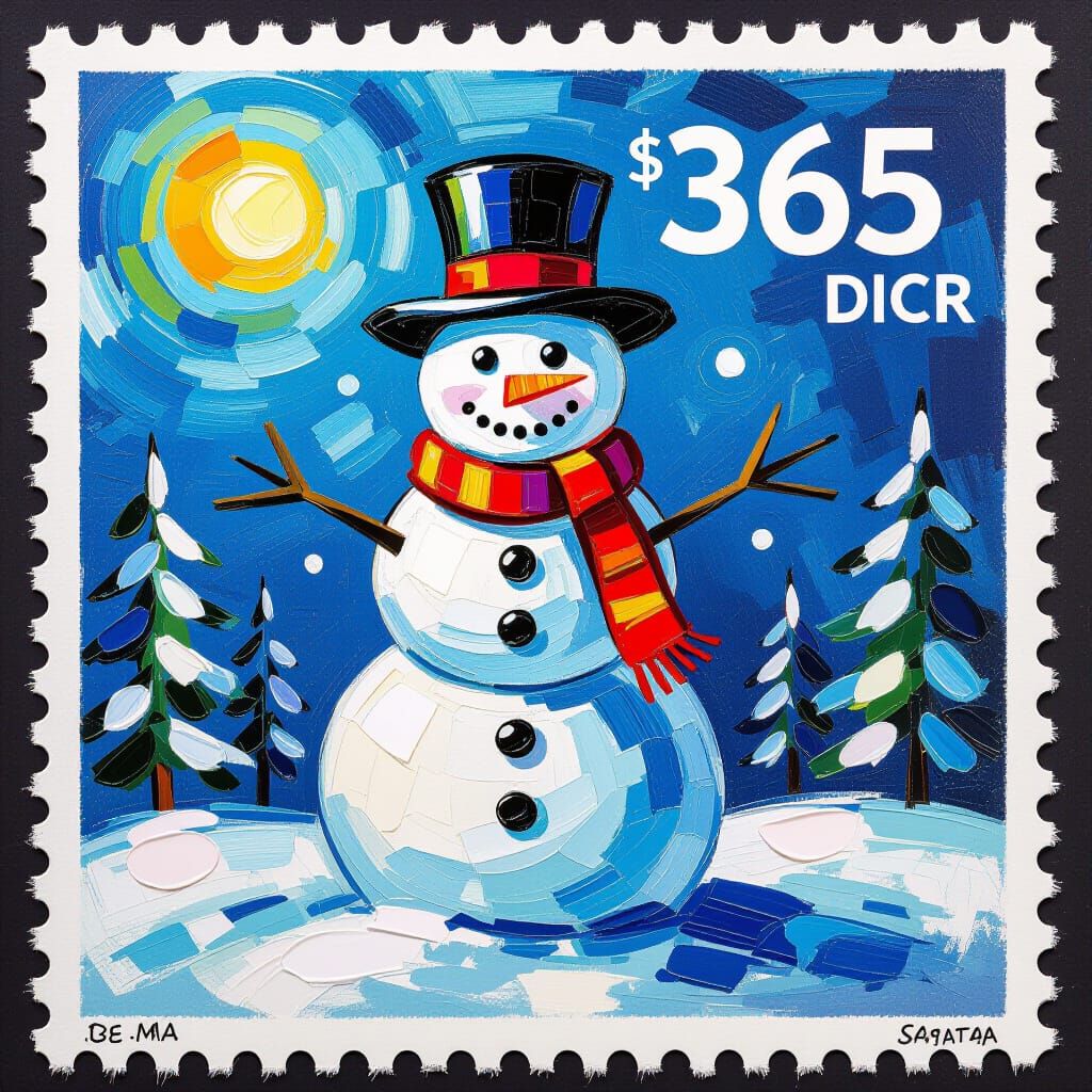 A vibrant Christmas snowman depicted on a postage stamp. This image showcases thick, textured brushstrokes and vibrant colors reminiscent of neo-impressionism and expressionism.