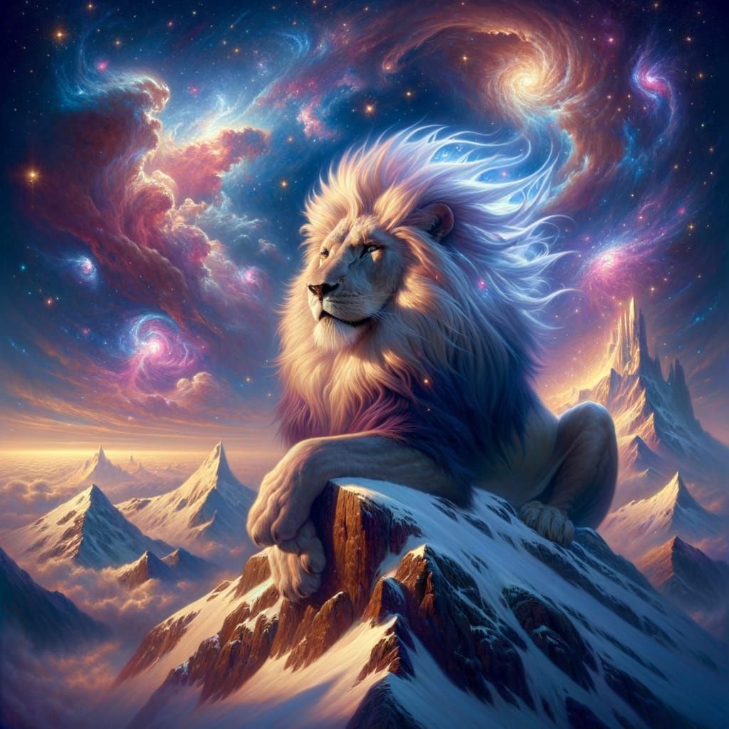 This breathtaking image depicts a regal lion sitting atop a snow-covered mountain, its stardust mane shining under a swirling nebula sky with distant galaxies in the background, evoking a sense of awe and wonder in a classic fantasy art style reminiscent of art nouveau and American impressionism.