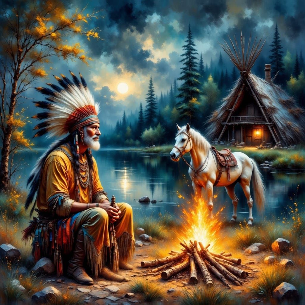 A vivid oil painting depicts an Indigenous man in traditional dress by a campfire. A white horse stands near a wigwam under a full moon, rendered in an impressionistic style.