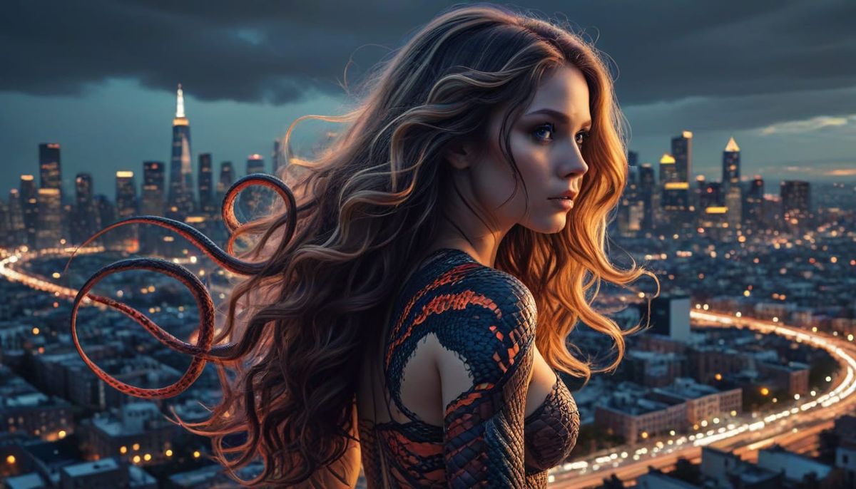 This image shows a cyberpunk woman with long wavy hair standing in a vibrant, highly detailed cityscape. Her intense gaze and chrome corset reflect the neon lights in this dreamlike scene.