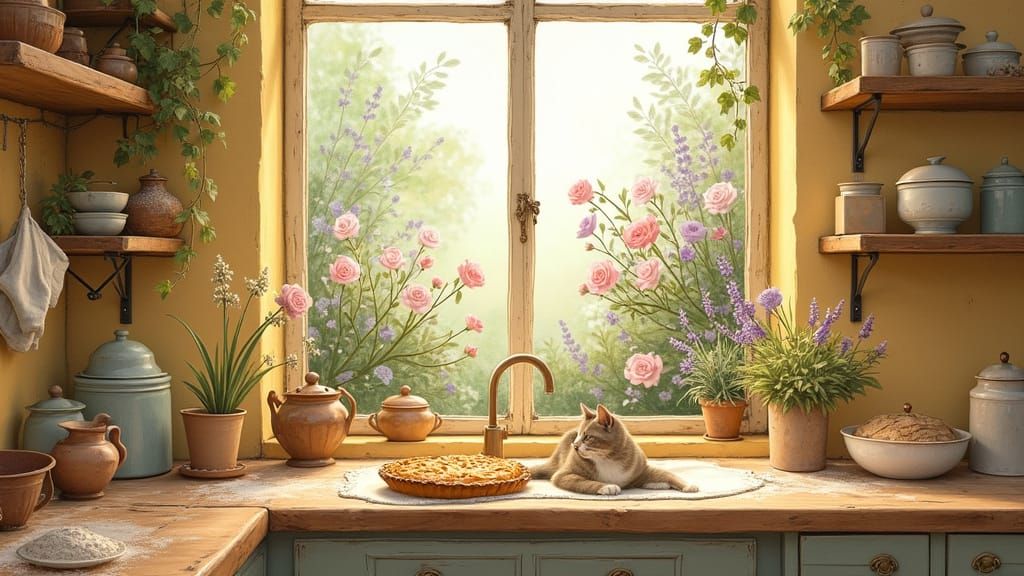 This charming kitchen scene features a warm, golden-lit space with worn wooden counters, surrounded by baking essentials and a beautiful garden view. A languid cat stretches on the windowsill, surrounded by lush roses and fragrant lavender, in soft pastel hues. Illustrated in a delicate, hand-drawn style...