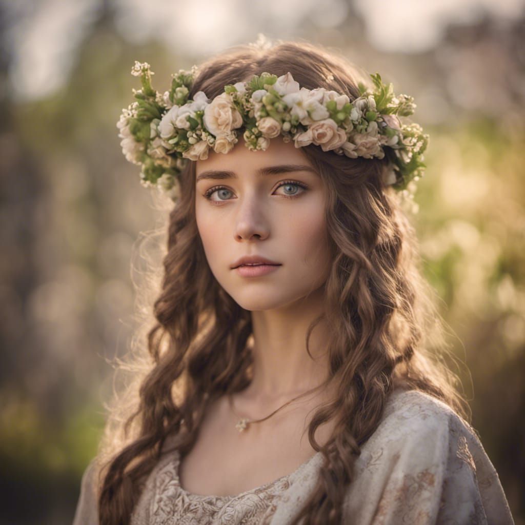 This image shows a teenage girl adorned with a floral crown, styled in ancient Roman attire. The photograph features a sharp focus, natural lighting, and a soft bokeh effect.