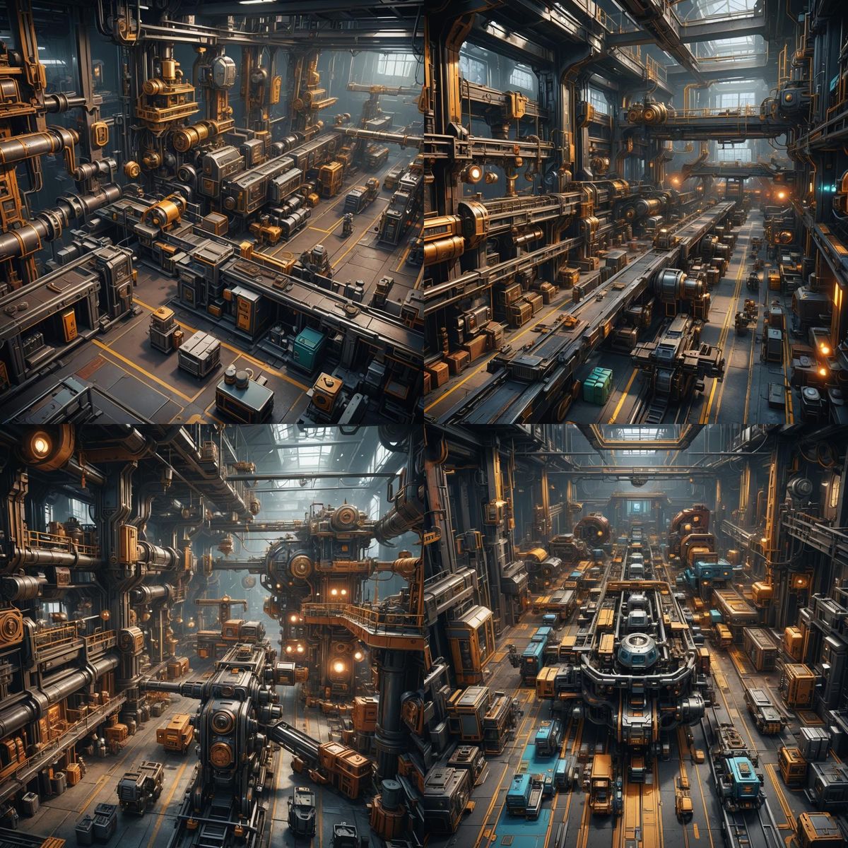 This image shows a highly detailed industrial assembly line. The matte painting features deep, rich colors and intricate details, rendered as fantasy concept art in 8k resolution.