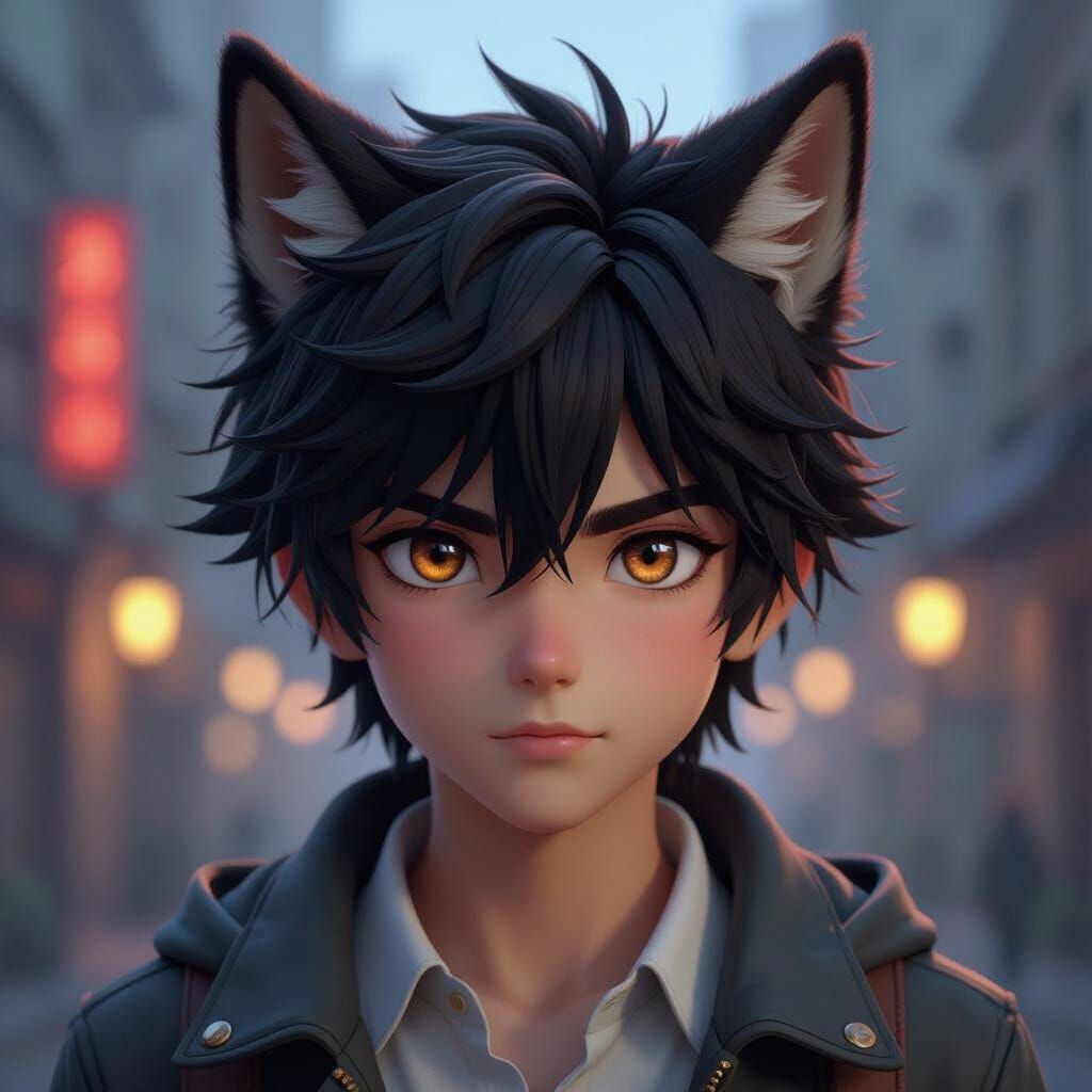 A cinematic image of an 18-year-old boy with wolf ears and coffee-colored eyes. The character is rendered in a stylized 3D anime aesthetic, with volumetric lighting and hyperdetailed textures.