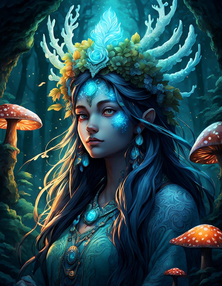 This image shows a vibrant manga-style splash art of a forest spirit in a misty grotto. The spirit wears a headdress with glowing flora and sits on a mushroom, depicted with intricate lines, soft light and lush details.