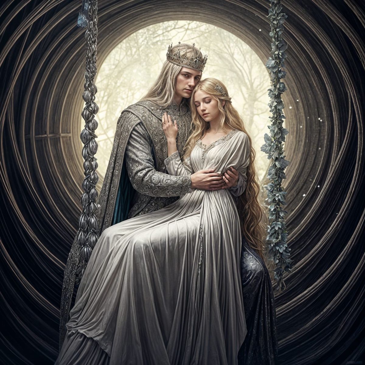This image shows a king and queen on a swing in a magical cavern. The scene is illuminated with soft lighting and glowing gems, rendered in a romantic fantasy art style.
