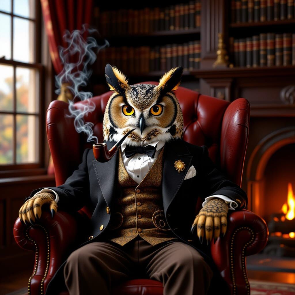 A hyperrealistic image of an anthropomorphic owl wearing a monocle and smoking a pipe. The owl sits in an armchair beside a fireplace in a room filled with books, with dramatic lighting.