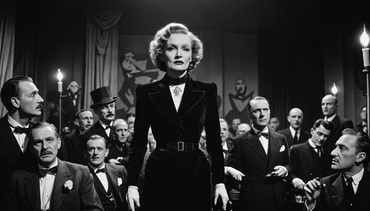 This image depicts a chaotic cabaret scene reminiscent of German Expressionism, featuring distorted figures and a gritty color palette. It critiques social decay with sharp lines and dramatic shadows.