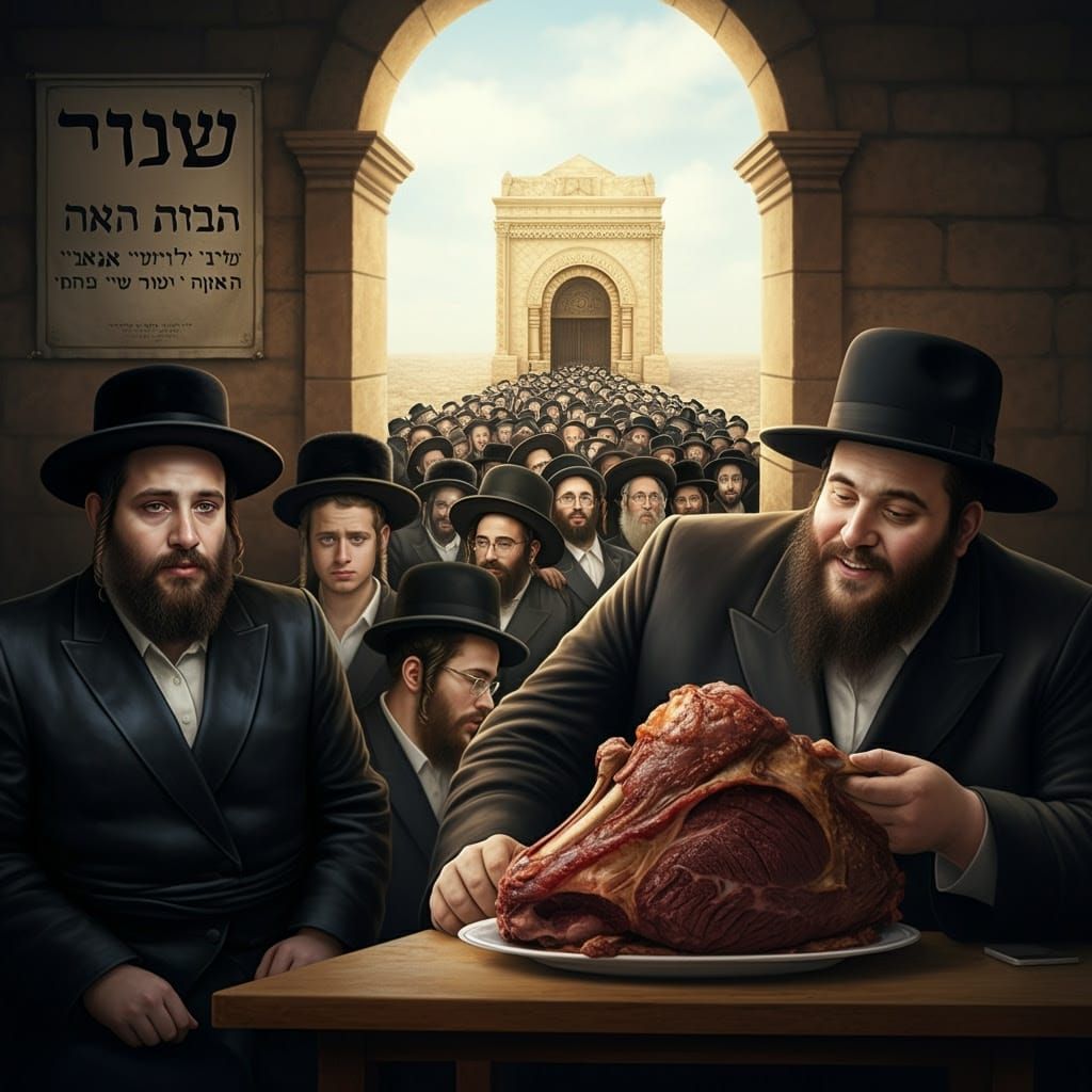 This image depicts a serene and somber scene of ultra-orthodox men gathered around a grand rabbi's tomb, with a winding queue of devotees stretching into the distance, set against a bright and sunny backdrop.