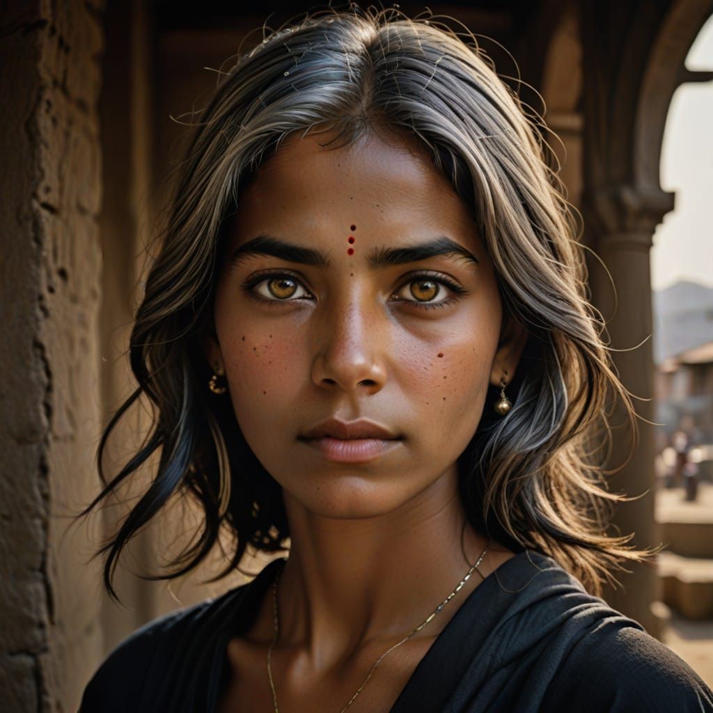 This striking portrait features a 29-year-old woman with silver hair, confidently standing in a close-up shot with shallow depth of field and vibrant colors. The image showcases expert studio lighting, flawless skin tones, and a captivating gaze, creating a majestic presence.