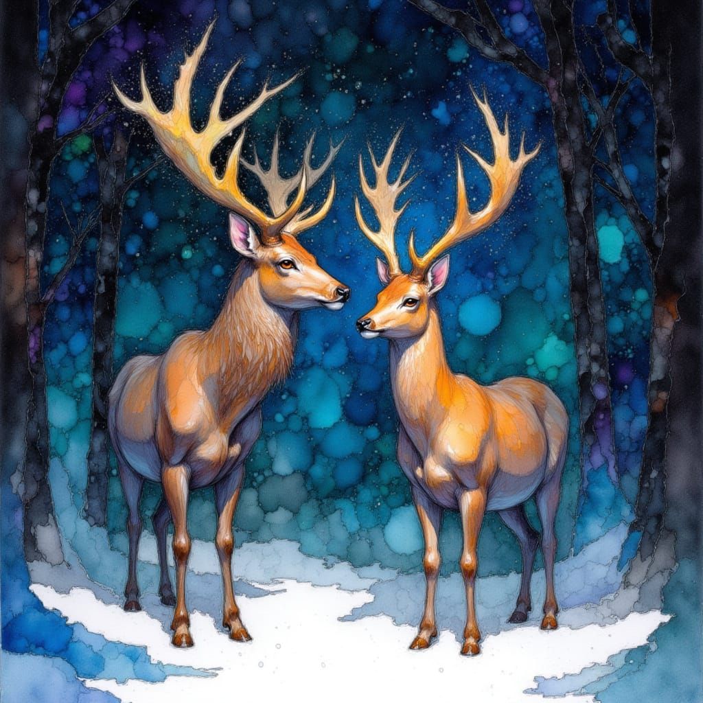 A magical deer couple in a forest glade at night. The sketch uses alcohol ink and color pencil techniques with ethereal lighting, creating a mystical scene.