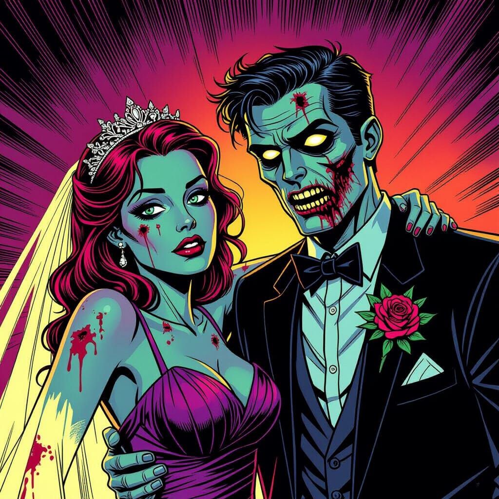 This comic book style image depicts a zombie prom night with vibrant colors and dramatic lighting. Inspired by bold linework and atmospheric storytelling.