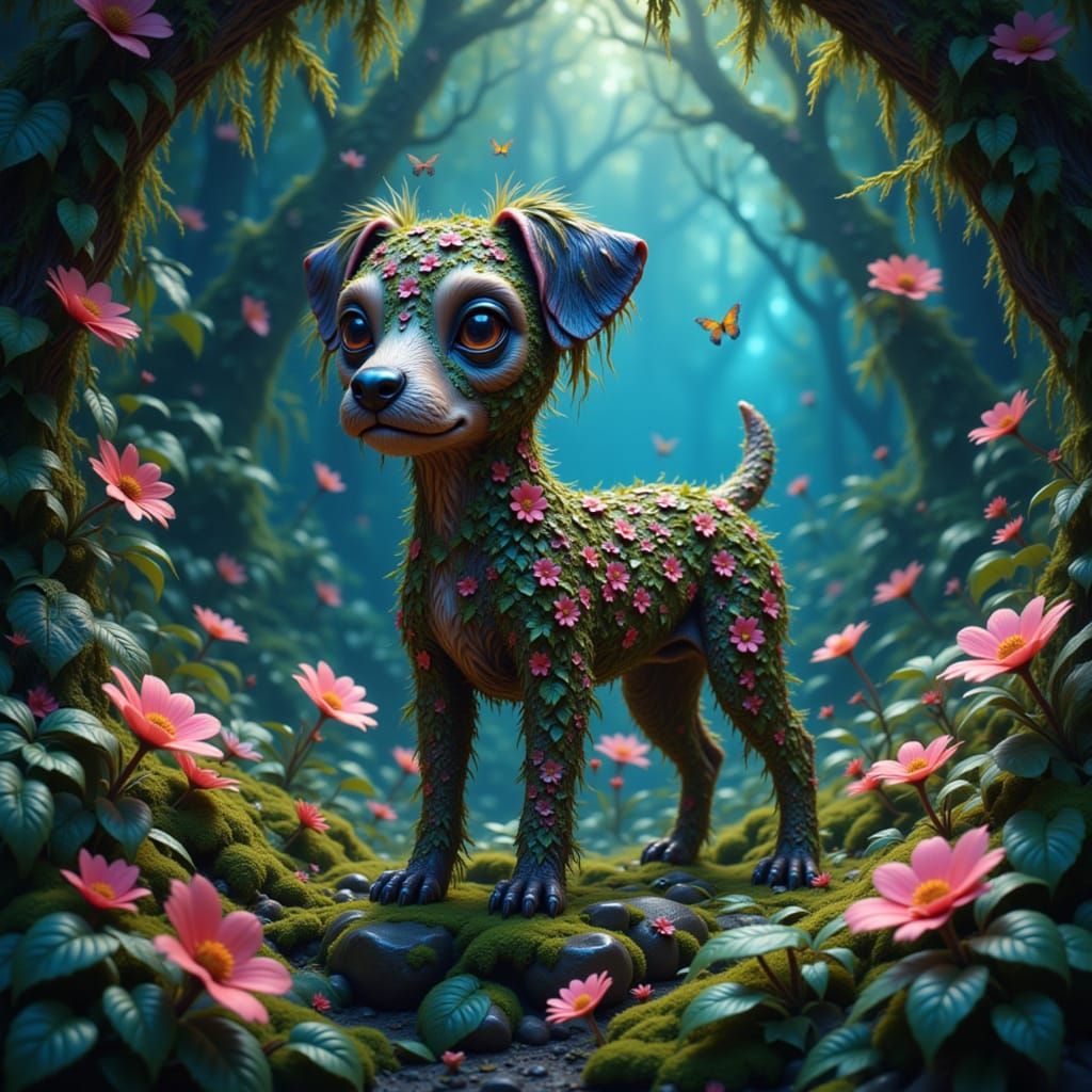 <lora:Forest Moss:1.0> A furniture dolly looking like a dog made of furniture. Luminescent flora and fauna inhabit its surreal canopy. The style is a highly creative blend of intricate Pointillist Surreal Fusion, creating a textured, dreamlike tapestry of life and mystery.