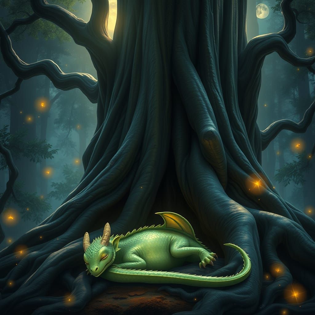 This serene image depicts a tiny, pale green dragon sleeping at the base of an ancient tree, surrounded by a mystical forest's misty veils, fireflies, and soothing sounds of the night, bathed in warm, cinematic light reminiscent of a Thomas Kinkade painting.