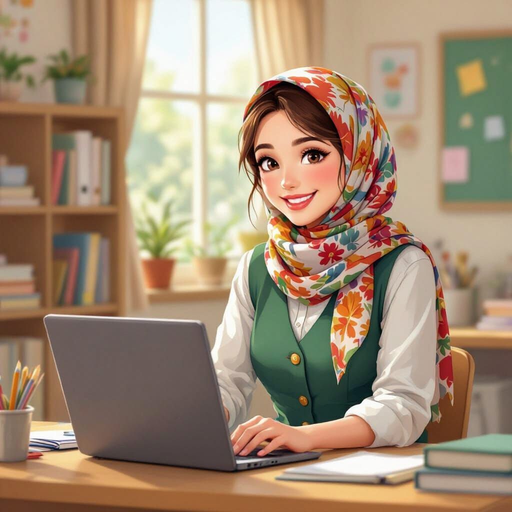This image shows a welcoming teacher in hijab greeting students. The scene evokes a cozy classroom setting in a vibrant, illustration art style with whimsical details and warm colors.