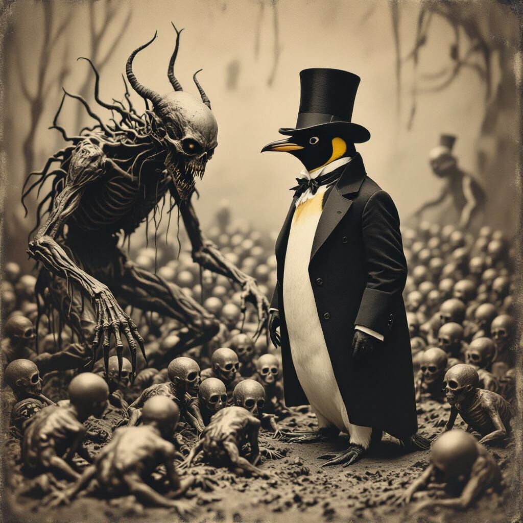 A vintage photograph of a penguin in formal wear, menaced by nightmarish creatures. The sepia tones and hyperdetailed textures evoke a surreal and unsettling scene of gothic horror.