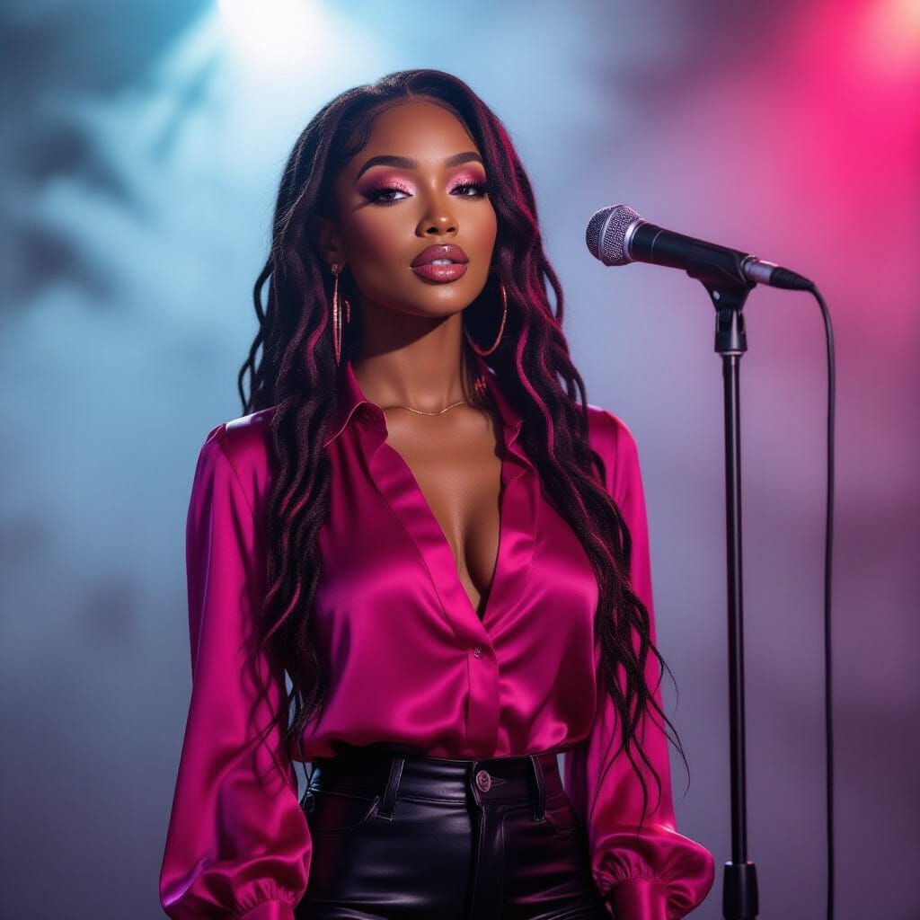 This ultra-realistic photograph captures a beautiful Black woman with smooth skin and natural makeup, exuding a soulful R&B artist vibe. Cinematic lighting creates moody shadows.