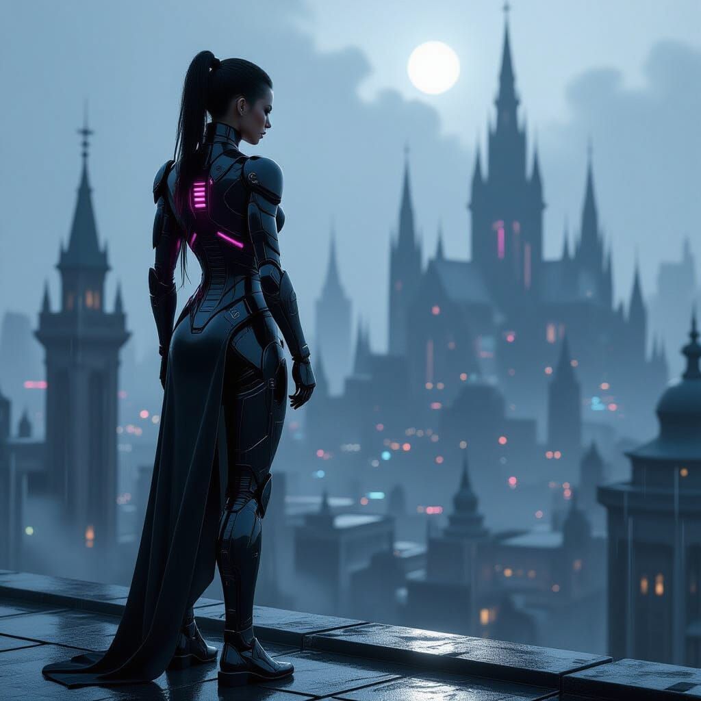This image depicts a solitary female cyborg warrior with a blend of organic muscle and chrome, standing on a rain-slicked rooftop. It features a gothic metropolis, cyberpunk accents, and noir shadows, rendered with cinematic lighting and a hyper-realistic finish.